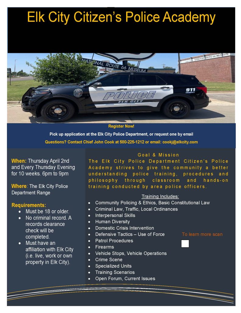The Elk City Police Department Citizen’s Academy is designed to educate the citizens of Elk City about the structure and duties of their police department. While this is not a certified training class it is an informational opportunity for a behind the scenes look at the Elk City Police Department.